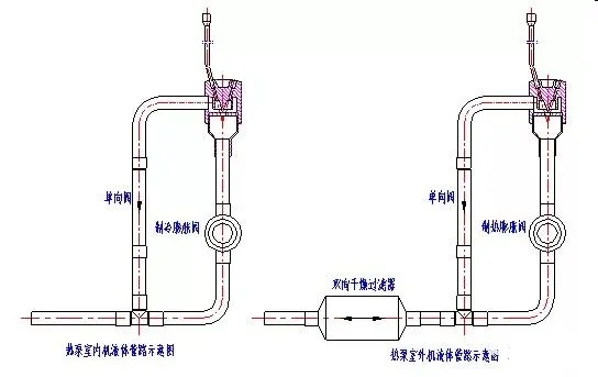 圖示翅片盤管作冷凝器使用時,冷凝液體直接通過單向閥,不通過圖中毛細管;作蒸發器用時,制冷劑經過主毛細管一次節流后,再由分流毛細管分流。