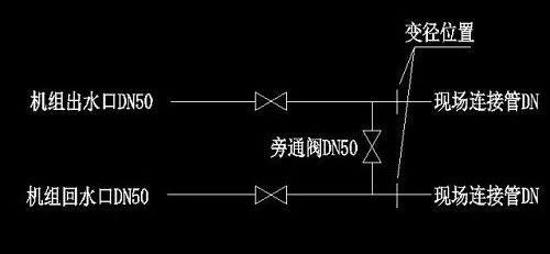 旁通閥門建議與機組的進出水口徑一致,若現場的變徑比例不大的情況下旁通閥門可以適當的減小但必須滿足機組的水循環。